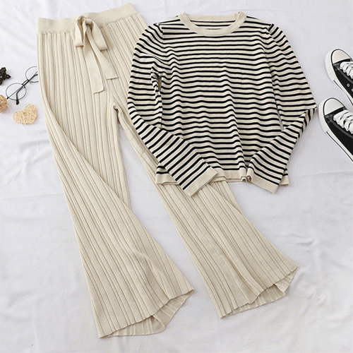 ボリュームのあるクールネックニットと、リラクシーなニットワイドパンツのセットアップ。